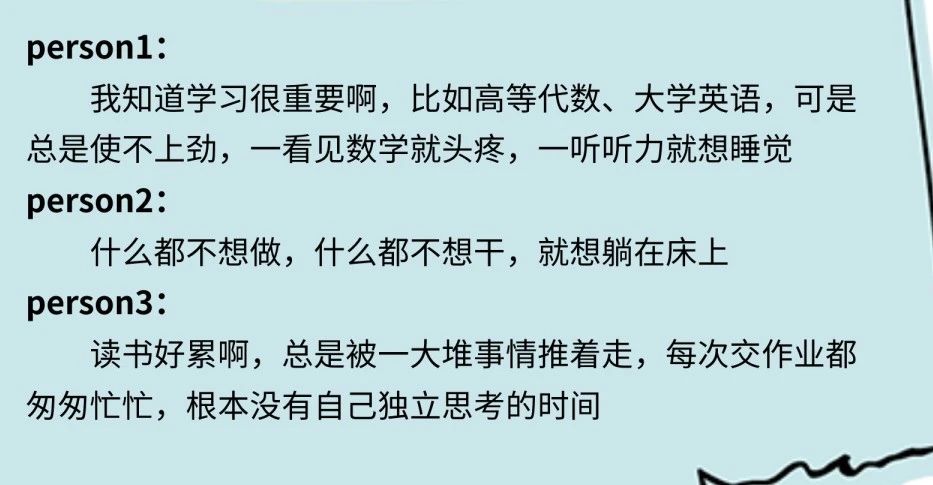 正如person3所说的一样,在如今快节奏的生活中我们往往很容易被一些事情推着走,却缺少了自己独立思考的时间,一旦外部事情变得更加繁琐,我们也会逐渐感到身心俱疲。
