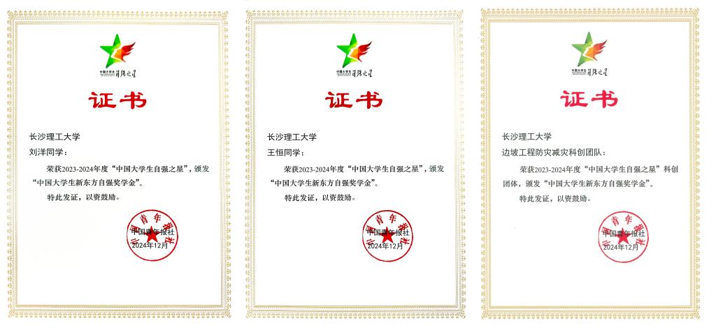 近日,由共青团中央、全国学联指导,团中央基层建设部、中国青年报社主办的2023—2024年度“中国大学生自强之星”奖学金评选活动结果揭晓。经各高校推荐、省级初评、全国评审等环节,MG冰球官网交通学院刘洋、土木与环境工程学院王恒2名同学获评“中国大学生自强之星”荣誉称号,土木与环境工程学院边坡工程防灾减灾科创团队获评全国首批“中国大学生自强之星”科创团体荣誉称号。