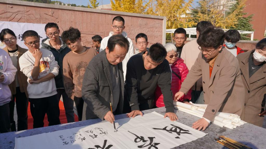 欣赏完同学们精彩的演出,聆听完老师的谆谆教导,便来到了各位老师为本次书画笔会活动题字的环节。“胸藏文墨怀若谷,腹有诗书气自华”各位老师勉励我们积前人之学,浴翰墨留香,去感受圣贤先哲的人格美,品位凝练典雅的书画美,现场的同学们驻足老师们的身旁观看这场美轮美奂的笔会!