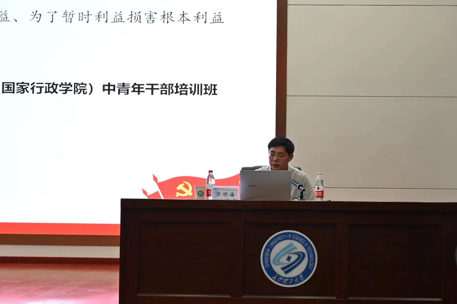 紧接着,本期“青马班”进行第一次理论授课。本次课程由马克思主义学院院长张明海主讲。他以“心怀‘国之大者’,肩负时代使命——学习习近平总书记关于‘国之大者’重要论述”为主题,从何谓“国之大者”、当代青年应心怀“国之大者”,肩负时代使命两个方面展开论述。带领学员们从传统意义和现代意义上分析了什么是“国之大者”,并强调“国之大者”是在深刻变革的时代中保持战略定力,是改革进入深水区需要克服诸多困难短板和梗阻,是推动党的自我革命的需要。他指出,“国之大者”不仅是价值理念,更是实践遵循。学员们应将小我融入大我之中;听党话、跟党走,树立“四个正确认识”,坚持胸怀天下;自觉践行社会主义核心价值观,有志气、骨气、勇气,不负时代,不负青春韶华。
