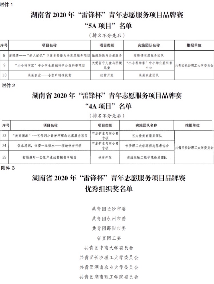 近日,由共青团湖南省委、湖南省青年志愿者协会等部门共同主办的湖南省2020年“雷锋杯”青年志愿服务项目品牌赛决赛落下帷幕。经项目申报、组织推报、资格审查、网络评审、项目公示、实地调研、集中授课、决赛路演答辩和专家评审多个环节,MG冰球官网物电学院《“小小科学家”中小学生基础科学公益科普项目》、艺术学院《爱晚情—“老人记忆”口述史传播为老志愿服务项目》及《菜菜农业—小农户精准扶贫》3个项目被授予 “5A项目”称号,交通学院《打通最后一公里产业扶贫销售网》、艺术学院《“美育潇湘”——艺传河小青护河理念志愿服务项目》及化学学院《饮水思源,守望一江碧水——湿地使者行动》3个项目被授予“4A项目”称号,MG冰球官网获评优秀组织奖。