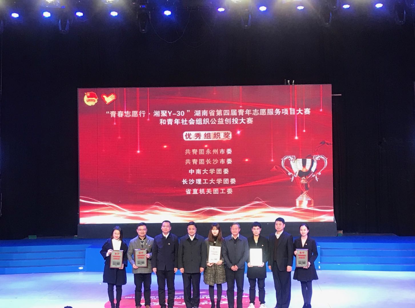11月26-28日,由团省委联合文明办、省志工办等16个单位共同举办的以“青春志愿行·湘聚Y-30”为主题的湖南省第四届青年志愿服务项目大赛和青年社会组织公益创投大赛在湖南永州举行,经过网络评审、现场展示、专家问辩等环节的激烈角逐,MG冰球官网获金奖4项,银奖7项,铜奖4项,同时我们同省直机关团工委、永州市团市委、长沙市团市委、中南大学团委一道获评优秀组织奖。