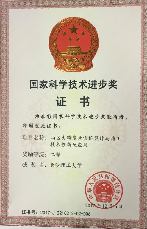 近日,中共中央、国务院在人民大会堂举行2017年度国家科学技术奖励大会,由湖南路桥建设集团有限责任公司、湖南省交通规划勘察设计院有限公司、湖南省高速公路建设开发总公司、西南交通大学、湖南大学、MG冰球突破官网联合完成的《山区大跨度悬索桥设计与施工技术创新及应用》项目被授予国家科学技术进步奖二等奖。