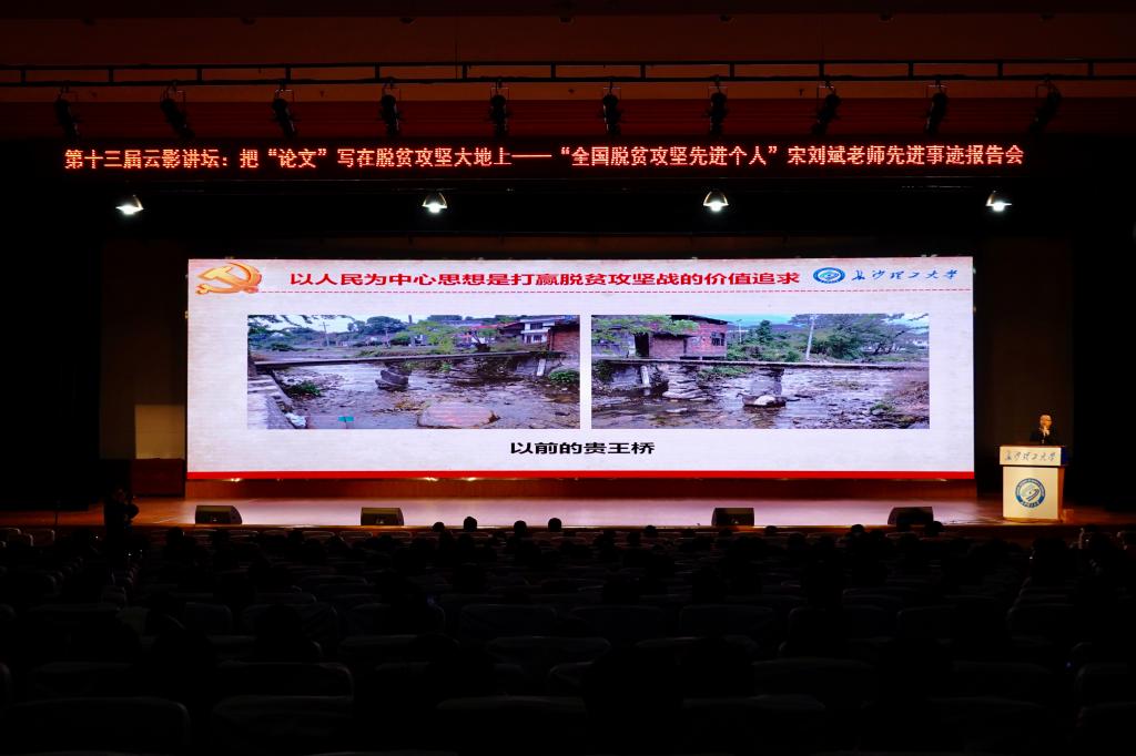 3月17日晚,第十三届研究生云影讲坛“把论文写在脱贫攻坚大地上”暨“全国脱贫攻坚先进个人”宋刘斌先进事迹报告会在金盆岭校区五教大礼堂举行。“全国脱贫攻坚先进个人”、MG冰球官网扶贫工作队队长宋刘斌,保卫处副处长、原扶贫工作队队员黄伟,扶贫工作队队员彭怡峰,研究生院副院长兼研工部部长田上,研究生志愿支教队首任队长谢扬同学与近千名研究生参加此次报告会。
