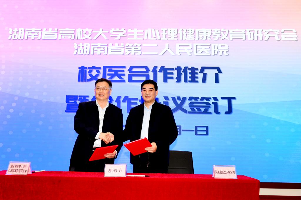 会上,湖南省第二人民医院发展服务部主任谌艾佳在会上介绍了校医合作内容和方式。湖南省高校大学生心理健康教育研究会和湖南省第二人民医院签订了校医合作框架协议。在未来3年,湖南省第二人民医院将支持湖南省高校与各地精神专科医院建立绿色通道,建立大学生心理危机干预快速转介、诊治机制;省第二人民医院将组织医生定期到学校开展诊疗活动和会诊,并为高校心理健康教育专职教师队伍提供相关专业能力培训。