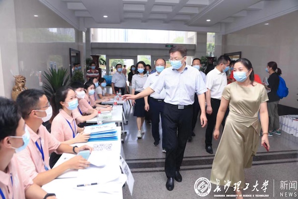 8月27日上午,校党委书记付宏渊,在校党委委员、宣传部部长方琼和党政办、研究与督查室、学工部(处)、保卫处、后勤中心等相关部门负责人的陪同下,深入云塘校区和金盆岭校区开展迎新工作检查。