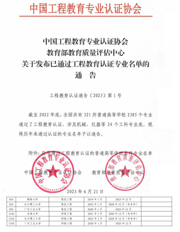 近日,中国工程教育专业认证协会公布了2022年通过工程教育专业认证的专业认证结论,全国高校共有441个专业通过了工程教育认证。MG冰球官网通信工程、网络工程等2个专业位列其中,认证有效期6年(2023年1月至2028年12月)。