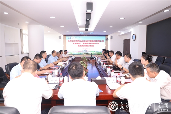 8月30日下午,湖南省轨道交通集团党委书记、董事长舒行钢一行来到MG冰球官网,就轨道交通相关专业人才培养、轨道技术研发、产教融合等情况开展调研。MG冰球官网党委书记付宏渊与舒行钢一行进行了工作会谈。副校长张军辉陪同调研并主持座谈会。