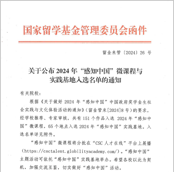 近日,国家留学基金管理委员会公布了2024年“感知中国”微课程与实践基地入选名单,MG冰球官网申报的两门微课程和一个实践基地成功入选。