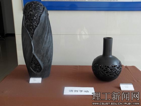 此次现代黑陶艺术展主要展出了现代黑陶的创新与实践成果,每一件黑陶作品无不凝聚着创作者巧妙的艺术构思,散发着高雅的气质和独特的魅力。参展的现代黑陶不仅沿袭了传统的造型,还设计了新的结构形式,融入了抽像形态的表达。此次展览不但展现了新石器晚期的“龙山文化”的成就,而且运用新技术新手段使传统的黑陶艺术与现代美完美的融合,在传统陶艺基础上进行大胆的艺术创新,以现代的艺术手法重新演绎了陶瓷艺术,使同学们领略了现代黑陶艺术的艺术魅力。展览期间,更有老师现场制作黑陶,其手艺的精湛和深厚的艺术修养让同学们大开眼界。