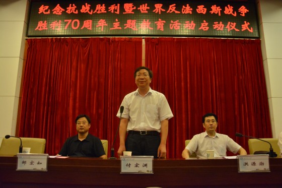 6月30日下午,MG冰球官网“纪念中国人民抗日战争暨世界反法西斯战争胜利70周年群众性主题教育启动仪式暨签名活动”在图书馆报告厅举行。校党委书记付宏渊、党委副书记洪源渤、副校长邹宏如以及职能部门和各学院相关负责人参加活动。校学生会、学生社团联合会和各学院学生代表共计300余人参加。启动仪式由学工部部长黄自力主持。