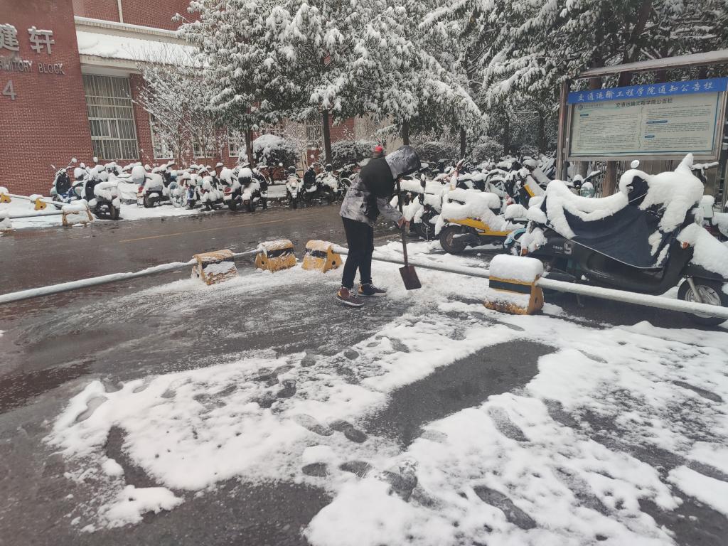 交运2001班学生乔润涛表示:“周日下午走出寝室,发现学院许多老师、同学顶着寒风清理积雪,心里很是感动,作为一名入党积极分子,我认为自己也有义务和责任为同学们办实事、办好事,因此也主动的加入到了打扫积雪的行动中!”