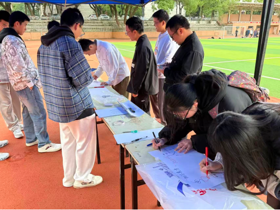 活动紧扣学院专业特色,设计了“物创标识”“电控传输”“圈住好礼”三大趣味环节,将专业元素与团队协作深度融合。在“物创标识——专业主题旗帜创作”环节,新生以班级为单位组队,围绕经典物理公式、电子元件符号等专业元素展开创作。白色旗帜上,薛定谔方程诠释量子奥秘,电路图勾勒学科特质,可爱卡通形象与严谨专业符号相映成趣,不仅展现了物电学子的创意才华,更让新生在创作中加深了对专业的初步认知。