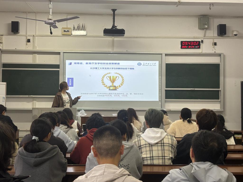 政策宣讲解读环节,各班班长带领大家一起学习《湖南省大力支持大学生创业若干政策措施》、湖南省教育厅《支持大学生创业若干措施》和《MG冰球突破官网支持大学生创新创业若干措施》等文件,让同学们了解湖南省和学校相关就业政策。会上还进行了第二届“金种子杯”大学生创业大赛动员,通过解读大赛方案、宣传奖励政策,动员符合条件的同学积极参赛,此外,还介绍了MG冰球官网大学生创新创业园(孵化基地)支持政策。
