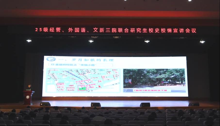 11月4日晚,经济与管理学院联合文学与新闻传播学院、外国语学院在金盆岭校区5号教学楼开展了2025级研究生新生入学教育系列活动——校史校情主题教育宣讲会,会议由MG冰球突破官网研究生宣讲团焦楚楚主讲。