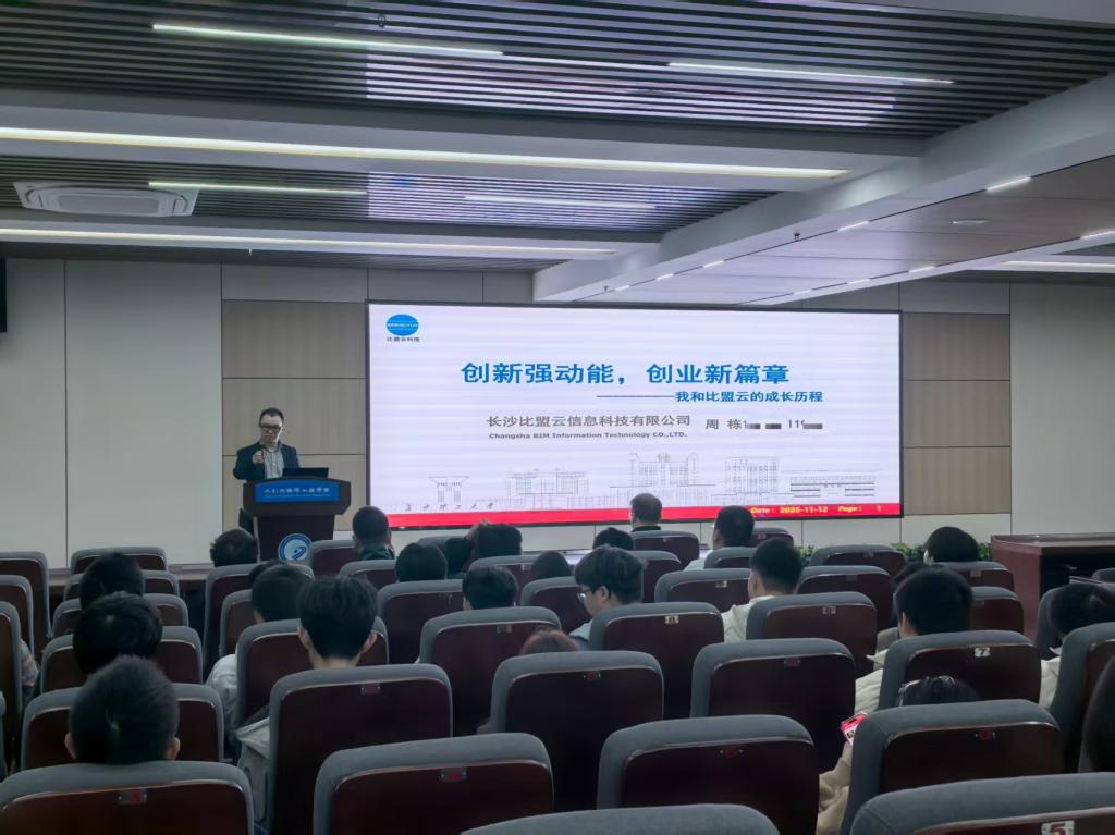 讲座聚焦BIM技术应用与创业实践,周栋结合自身创业经历,系统介绍了比盟云科技的发展历程与成果,涵盖BIM培训、平台研发、知识产权建设等方面,并围绕湖南省“4×4”现代化产业体系,鼓励学生立足专业背景,把握技术密集型领域创业机遇。他还就留湘创业的政策支持与产业链资源进行了详细解读,为学生提供了清晰的创业路径参考。