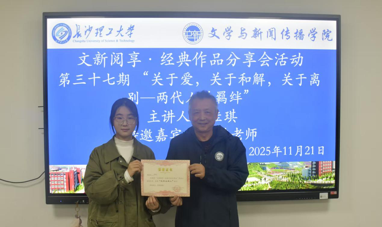 11月21日晚,文新学院第三十七期“文新阅享·经典作品分享会”在金盆岭校区九教223团体成长辅导室举办。本期活动由汉语言2403班施佳琪主讲,以“关于爱,关于和解,关于离别——两代人的羁绊”为主题,介绍了青年作家毕啸南的作品《在你们离开以前》。中文系教师周云鹏作为本次分享会的特邀嘉宾。