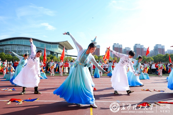 在激昂的音乐中,国旗护卫队、校旗护卫队、鲜花队、彩旗队以及学院、分工会基层组织组成的方阵依次入场。热情洋溢的啦啦操、典雅飘逸的扇子舞、具有民族特色的优美舞蹈、绚丽惊艳T台走秀……各学院精心准备的节目轮番上演,精彩纷呈。其中,体育学院教师方阵带来的节目《群猴欢聚云影湖》,巧妙融合现代拉丁舞、操化技艺与中华传统文化元素,一招一式间尽显风采。方阵表演各具特色、创意无限,令在场的观众赞叹连连,充分展现了长理师生积极向上、团结活泼的精神风貌。