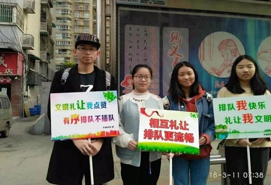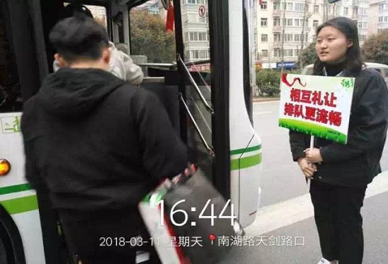 为积极响应校团委“六个一”学雷锋志愿活动,3月11日,数统学院的志愿者们来到天剑社区,配合社区居委会开展了“文明礼让”公交站台秩序员志愿活动。