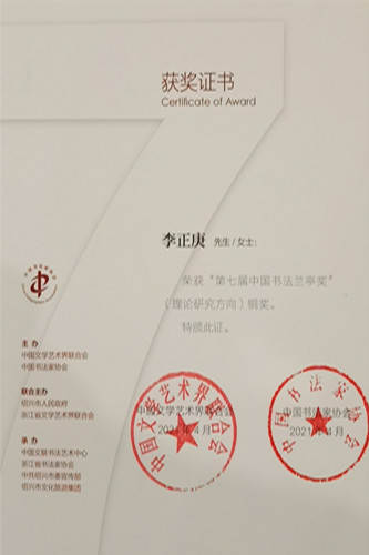 2021年4月14日,第七届中国书法兰亭奖颁奖活动在绍兴兰亭书法博物馆举行。中国书法兰亭奖是经中宣部批准,由中国文学艺术界联合会、中国书法家协会主办的中国书法艺术最高奖,是18个国家级文艺奖项之一。此次活动为深入贯彻落实习近平总书记关于文艺工作的重要论述和党中央关于文艺工作的重大决策部署,坚持“公平、公正、阳光、干净”的评奖原则和“植根传统、鼓励创新、艺文兼备、多样包容”的评奖导向,共评选出创作方向、理论方向15位获奖作者,其中理论方向金奖1人、银奖2人、铜奖2人。