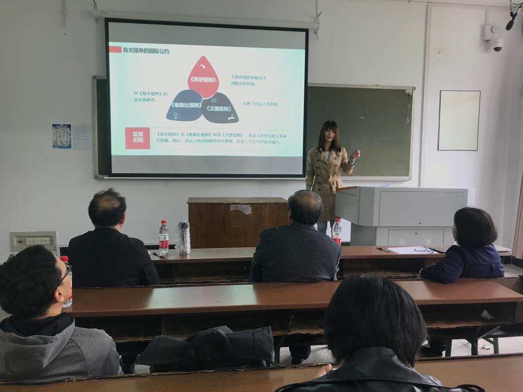杜卫红首先介绍了比赛的流程以及评分标准。随后两名老师分别以《作品的概念》《国际海上货物运输的承运人责任》两堂专业课,进行了课程思政教学。比赛中,两位老师结合课程特点,深入挖掘课程蕴含的思想政治元素和所承载的育人功能,通过融入时政热点、法治意识、社会责任、人文精神等要素,展示了良好的教学设计和教师风采。三位评审专家逐一对参赛选手进行点评,评审专家一致认为参赛教师教学态度认真、教学基本功扎实,并对青年教师的课程思政改革给予了肯定,指出老师们能够在课程内容里积极挖掘思政元素,通过日常的教学活动,将正确的意识形态传达给每位学生,这是落实“立德树人”根本任务的一个特别好的传达手段。