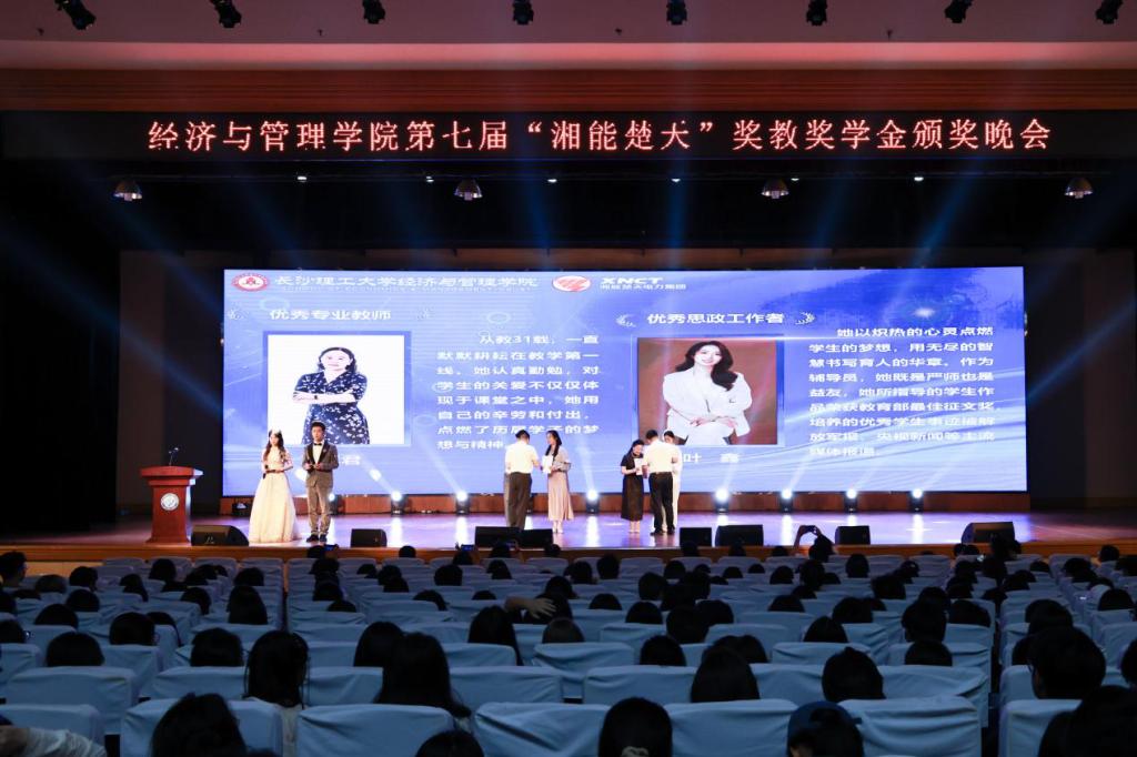 5月27日晚,经管学院第七届“湘能楚天”奖教奖学金颁奖晚会在五教大礼堂举行。湘能楚天电力集团董事长陈伟其、党支部副书记王丽杰,校党委委员、副校长刘朝晖,校友中心主任唐青,创业就业指导处副处长贺佐杰,校团委副书记陈璐莎,经管学院全体班子成员、全体辅导员、专业老师代表和学生代表上千人齐聚一堂,共襄盛举。