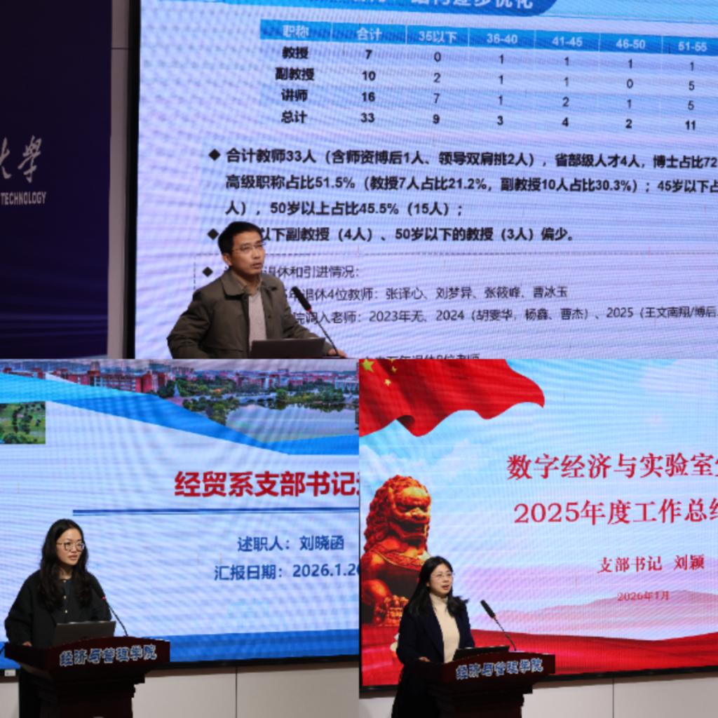 会上,部分教学系室和教工党支部进行述职汇报。金融系主任王伟汇报了系室在科研、教学、团队建设与人才培养等方面的突出成绩,并剖析了当前存在的问题与下一阶段的工作思路。经贸系党支部2025年获评校级“党建工作样板支部”,党支部书记刘晓函系统总结了支部建设经验,分享了支部围绕中心抓党建的举措和成效。数经系党支部书记刘颖汇报了支部在理论武装、党建与业务深度融合等方面取得的进展,并分享了以党建引领系室发展的特色做法与实际成效。