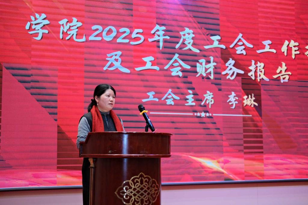 随后,李琳作2025年度工会工作报告及工会财务工作报告。报告从服务教职工成长、丰富文体活动等方面进行梳理,总结了工会过去一年的工作成效。
