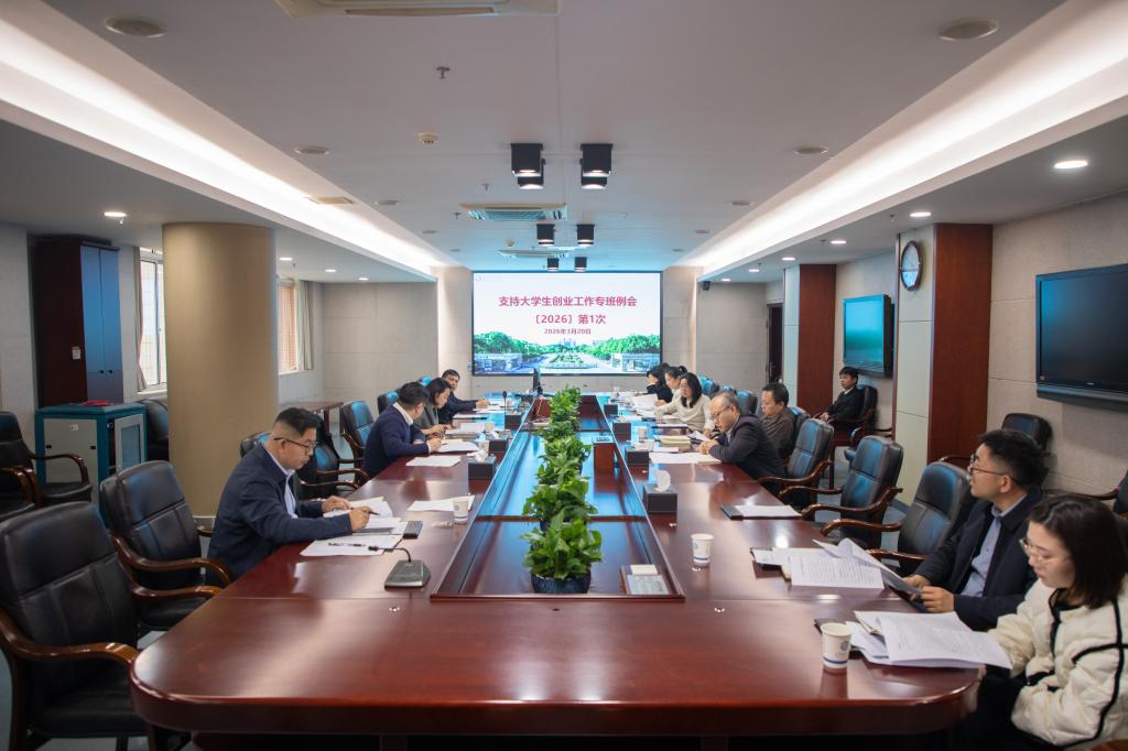 会上,通报了《支持大学生创业2026年工作要点》。宣传部常务副部长邱国良传达了全省大学生创业品牌宣传工作推进会会议精神。会议指出,2026年是支持大学生创业工作深化拓展之年,要锚定“打造全国乃至全球大学生创业目的地”的战略目标,纵深推进“七个一”战略举措,持续优化政策保障、资源赋能、服务供给和环境支持。创业就业指导处处长田上汇报了2025年支持大学生创业工作的落实情况及当前存在的困难问题,对照《2026年支持大学生创业工作提示》,解读了学校2026年重点工作任务及工作分工。创业专班成员单位负责人围绕政策保障、课程建设、导师队伍建设、孵化基地提质、创业竞赛、创业文化等工作的推进情况逐条进行汇报交流。会议明确,要重点突破教师单独评职称等难题,修订完善学分认定、转专业、评优评奖等实施细则,调动师生投身创业的积极性。