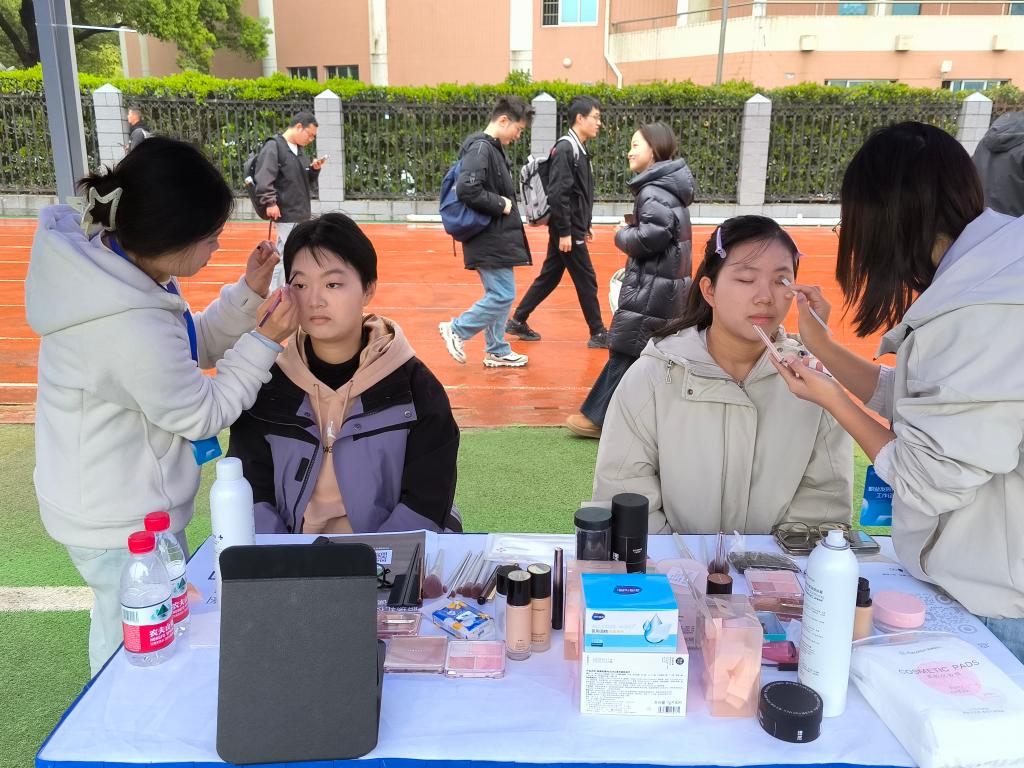 其中,形象指导专区首次聚焦职场妆容与形象管理,成为本次双选会的一大亮点。学校创业就业指导处牵头组建的朋辈导师团队现场值守,他们用同龄人的视角,围绕职业妆容、发型设计、服饰搭配等内容,为毕业生提供个性化的指导。从底妆选择到眉形设计,从口红颜色到整体气质提升,朋辈导师们结合自身经验与所学知识,根据每位同学的个人特点与目标岗位需求,耐心讲解、现场示范,帮助大家在细节中展现更专业、更自信的职场形象。