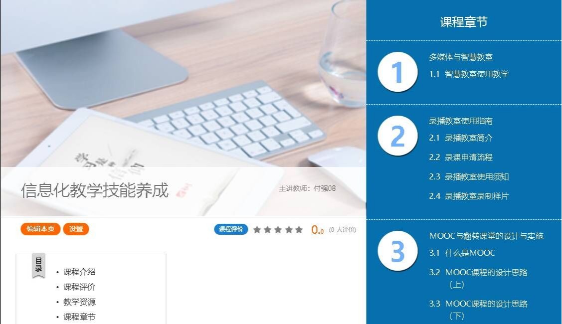 主要介绍教师在教学中需要掌握的基本信息化技能,包括多媒体教室与智慧教室,录播教室,MOOC与翻转课堂,视频及动画制作,办公软件技能等。