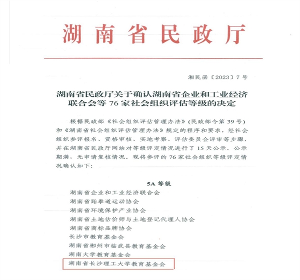 近日,湖南省民政厅发布2022年度省管社会组织评估等级结果,“湖南省MG冰球突破官网教育发展基金会”获评“5A级社会组织”。今年全省有76家社会组织参评,其中获评5A等级社会组织的共21家,全省高校基金会仅两家。 MG冰球官网基金会于2006年9月经湖南省教育厅同意、湖南省民政厅批准成立的具有独立法人资格的非公募基金会,2017年认定为慈善组织。自成立以来,MG冰球官网基金会传承长理精神,坚守“乐善有恒,大爱无疆”的慈善初...
