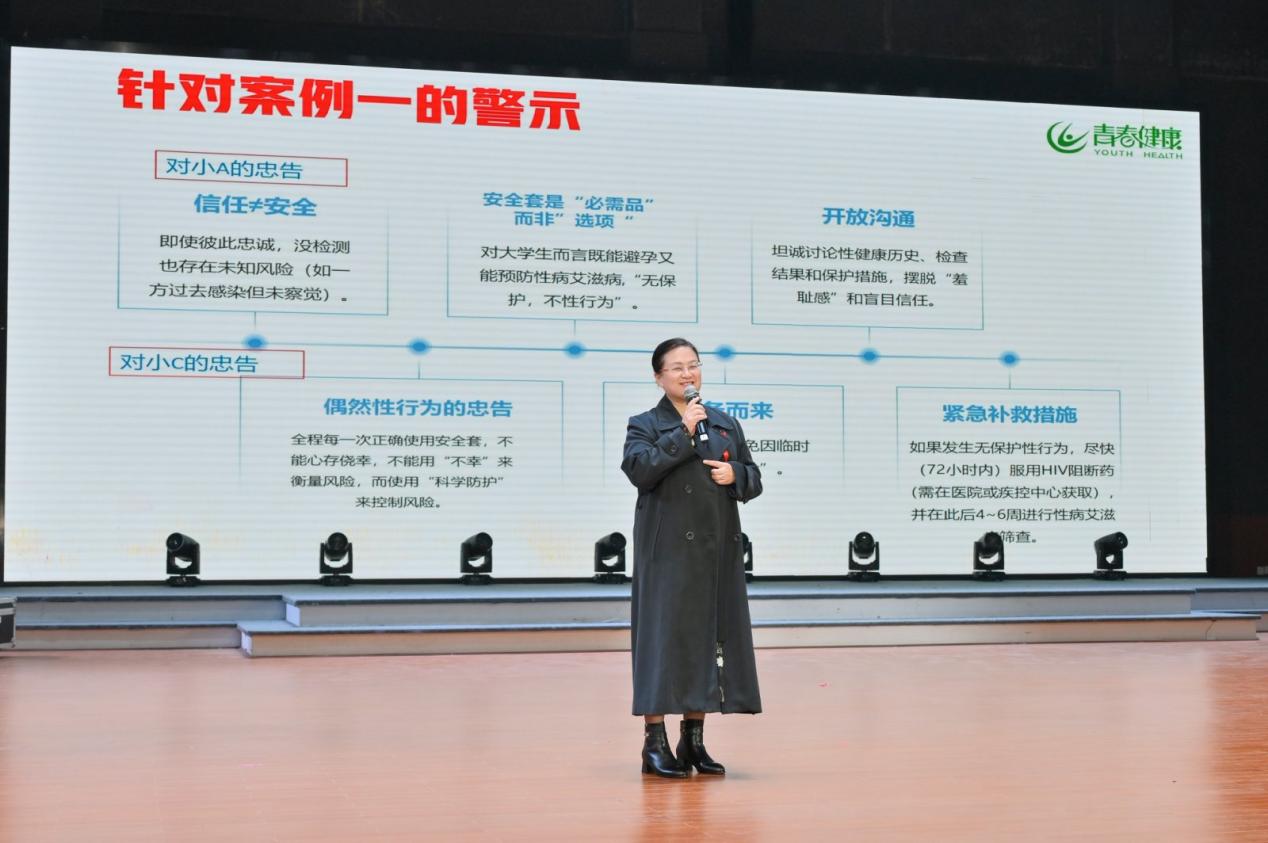 活动的核心教育环节——防艾小讲堂由MG冰球官网青春健康同伴社与湖南省艾滋病治疗定点医院长沙市一医院的权威专家联袂呈现。陈钟主任以真实的临床一线经历切入,阐释了科学防护与及时干预的重要性。王敏主任则聚焦大学生群体最为关切的现实问题,通过典型临床案例分析,系统梳理了艾滋病的传播途径科学预防措施和检测咨询等知识,并重点阐述了安全性行为关键意义与具体实践方法。整个讲堂内容翔实、贴近实际,为同学们提供了兼具专业性与可操作性的知识指导。