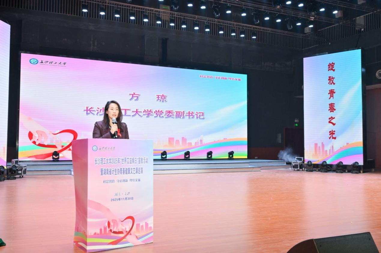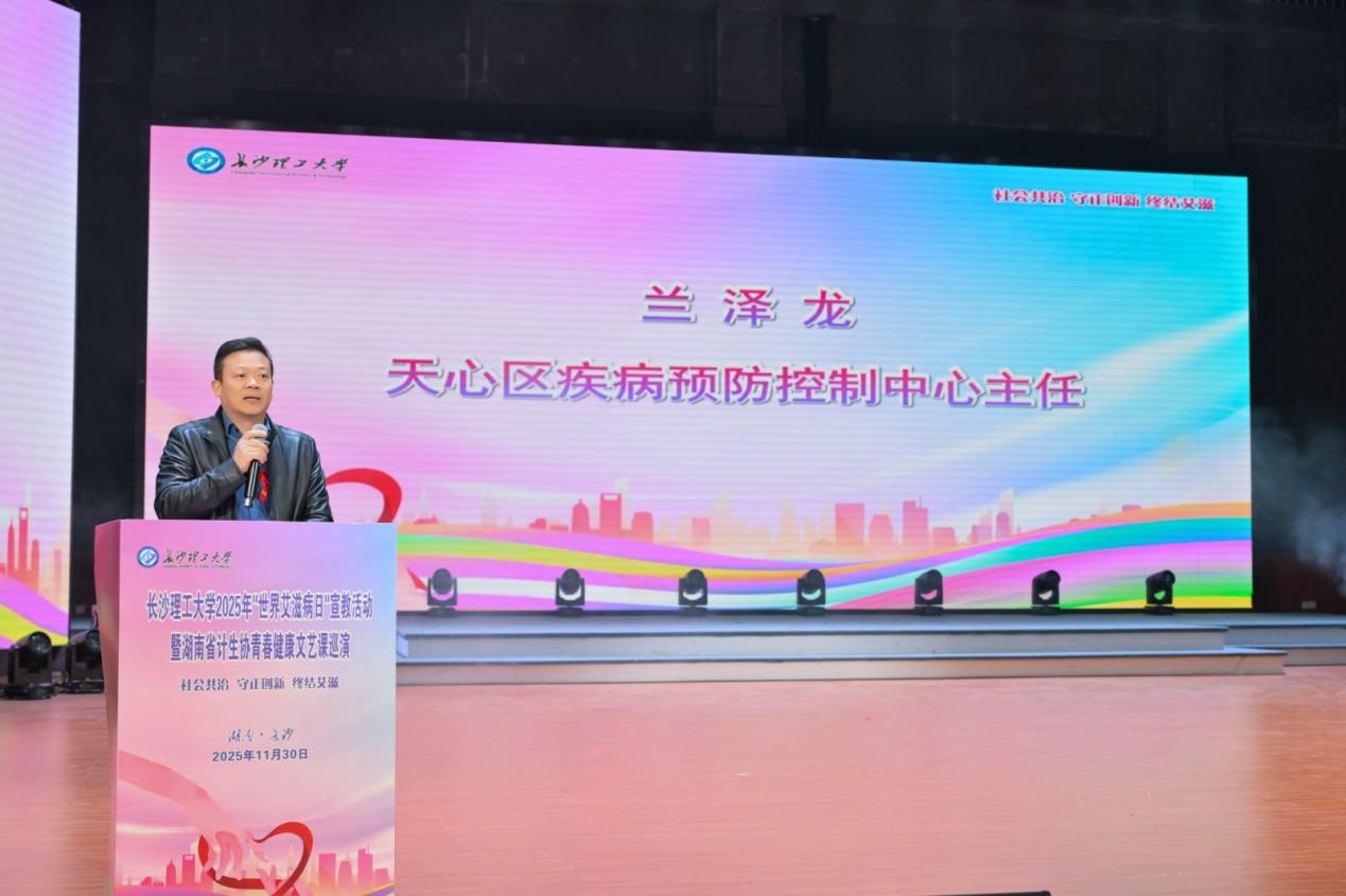 为积极响应国家关于艾滋病防治工作的号召,深入推进健康校园建设,提升大学生艾滋病防控意识和能力2025年11月30日晚,以社会共治,守正创新,终结艾滋为主题的2025年世界艾滋病日宣传教育活动在MG冰球官网云塘校区大会堂隆重举行。
