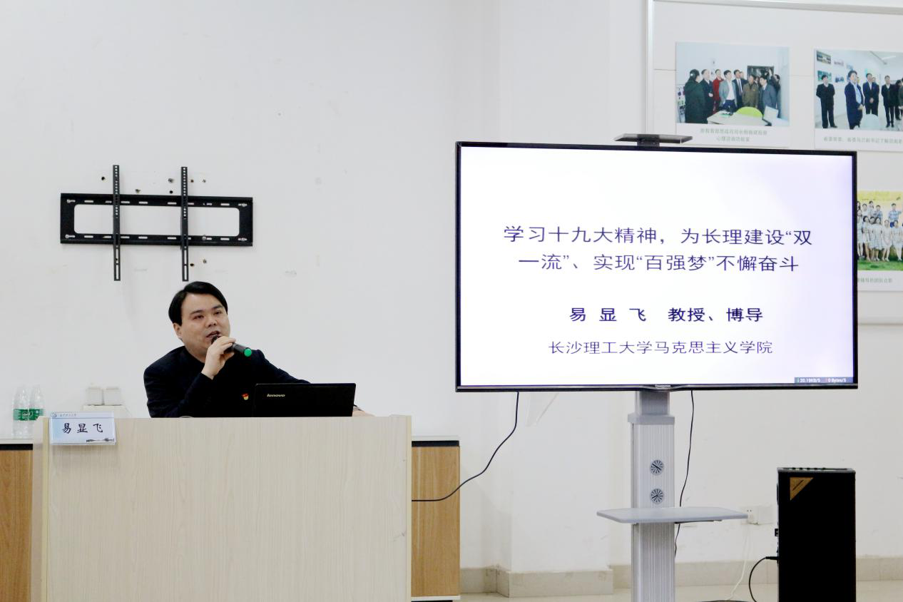 易显飞从大会盛况及总体情况介绍开始,以中华民族伟大复兴中国梦为主线,把十九大报告的主要内容按逻辑递进的顺序进行了逐一阐释。对中国共产党人的初心和使命及“四个伟大”、中国特色社会主义进入新时代、我国社会主要矛盾的演变历程及当前的主要特征、习近平新时代中国特色社会主义思想是马克思主义中国化的最新成果、新时代坚持和发展中国特色社会主义基本方略、确定全面开启建设社会主义现代化国家新征程的目标与新时代的“三大任务”、全面加强党的领导与全面从严治党等八个方面进行了重点解读与高度概括。他强调,学习宣传贯彻党的十九大精神,需要结合具体实际,把党中央的战略部署转变为本单位、单位每个人的工作任务,每个人都应该根据自己的当下任务,拿出工作方案,排出任务表、时间表和路线图,以脚踏实地精神全面抓好落实十九大精神。