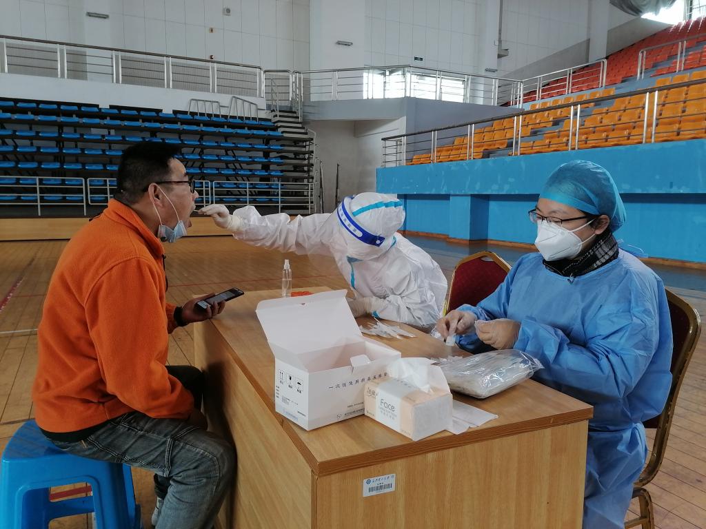 (核酸检测现场,志愿者正在逐一扫码、录入身份信息)
