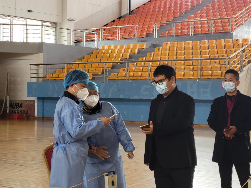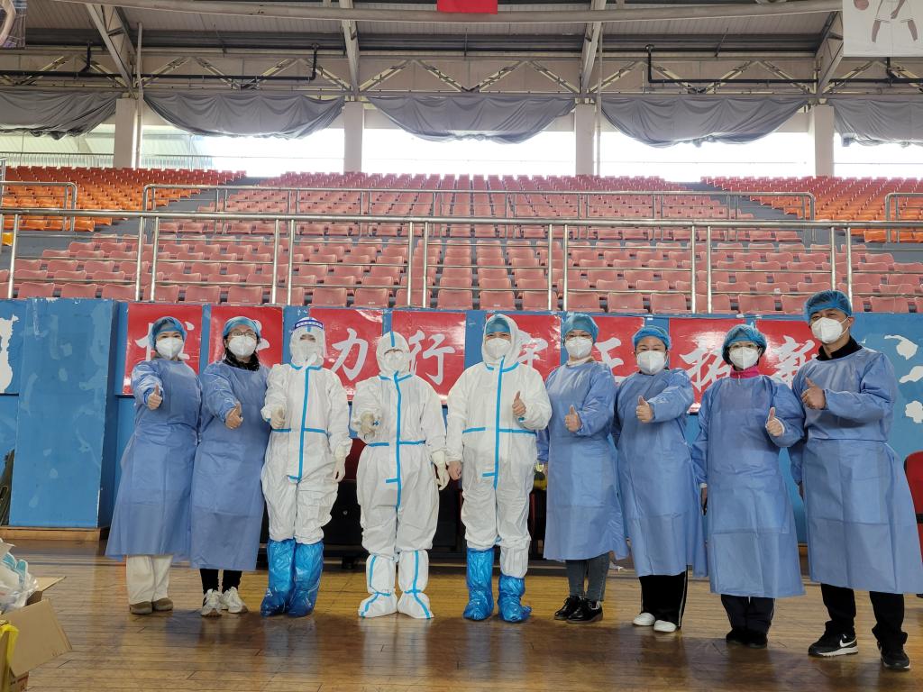 (志愿者与医院工作人员在核酸检测点现场)