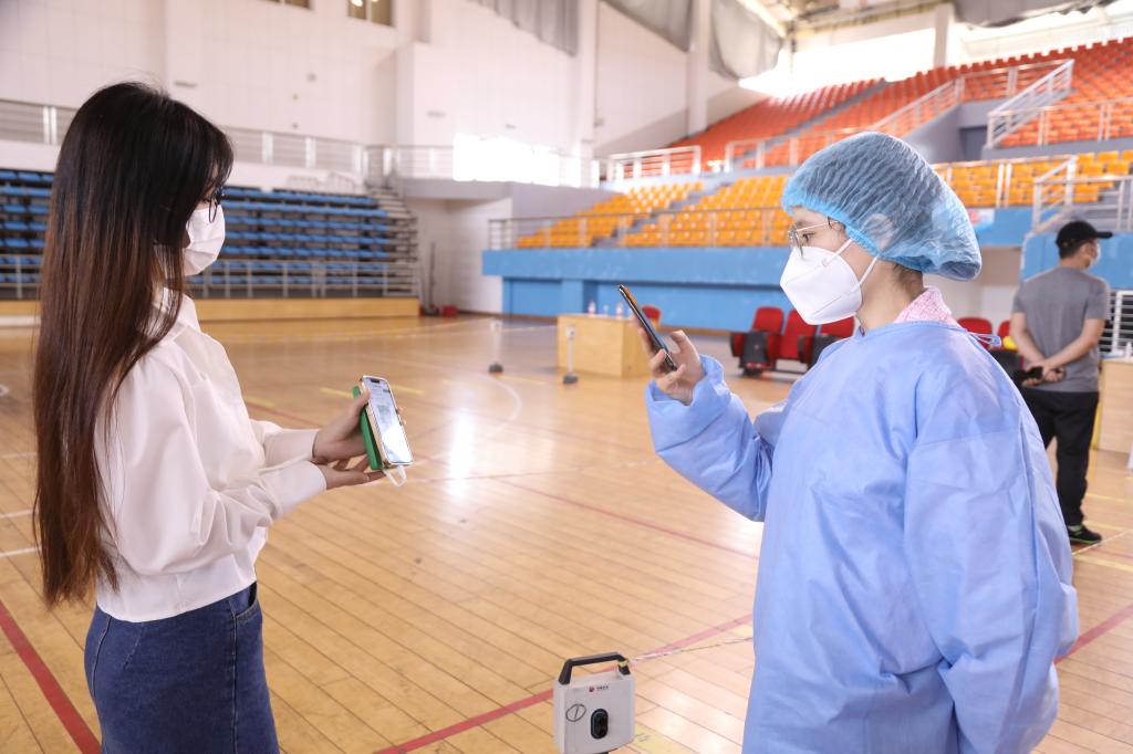 (核酸检测现场,志愿者正扫码、录入身份信息)
