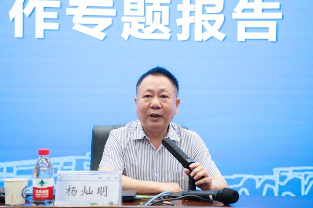 杨灿明作题为《高校教师的三个“度”》主题报告。他结合自身丰富的人生阅历和独到的科研经验,从高校教师“生命的高度在学术”“生命的宽度在学科”“生命的长度在学生”三个方面着重阐述其科研理念、育人心得、人生感悟,为研究生导师提供了宝贵建议。