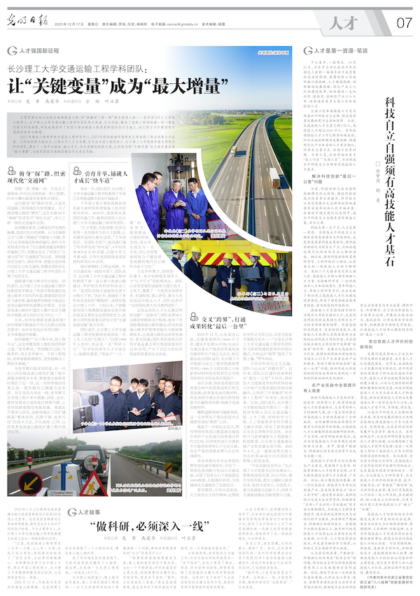 12月17日,《光明日报》人才版专版报道MG冰球官网人才工作。在人才强国新征程板块刊发《MG冰球突破官网交通运输工程学科团队:让“关键变量”成为“最大增量”》文章,在人才故事板块刊发《“做科研,必须深入一线”》文章。