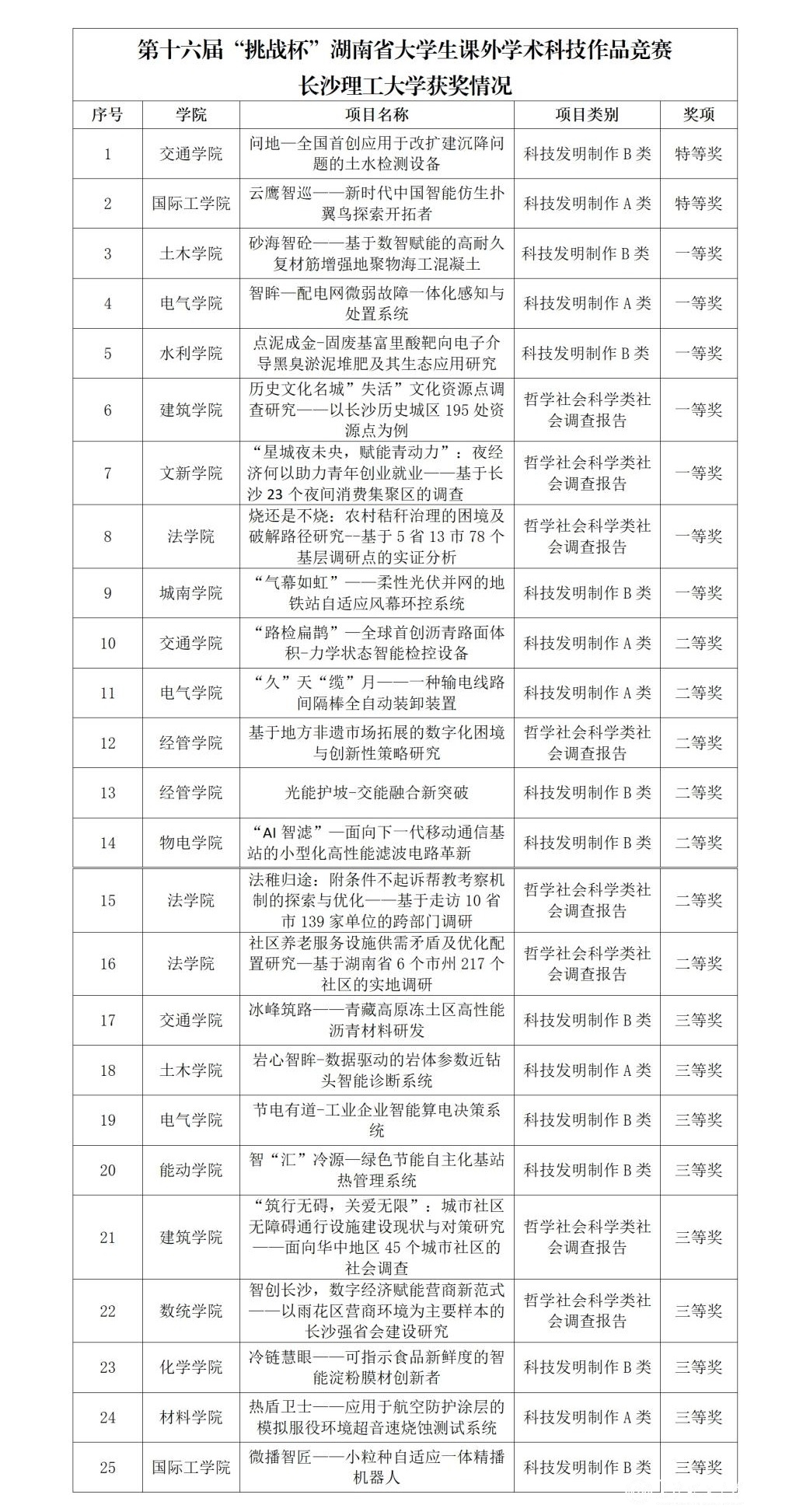 经激烈角逐,MG冰球官网交通学院《问地——全国首创应用于改扩建沉降问题的土水检测设备》、国际工学院《云鹰智巡——新时代中国智能仿生扑翼鸟探索开拓者》获特等奖;法学院《烧还是不烧:农村秸秆治理的困境及破解路径研究——基于5省13市78个基层调研点的实证分析》等7件作品获一等奖;物电学院《“AI智滤”——面向下一代移动通信基站的小型化高性能滤波电路革新》等7件作品获二等奖;数统学院《智创长沙,数字经济赋能营商新范式——以雨花区营商环境为主要样本的长沙强省会建设研究》等9件作品获三等奖。