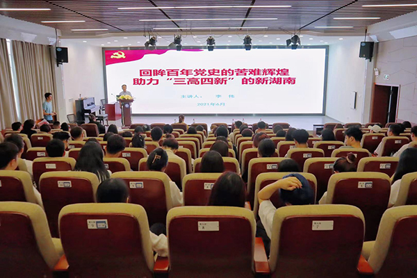 李伟以《回眸百年党史的苦难辉煌  助力“三高四新”的新湖南》为题,与大家回顾了党艰苦卓绝、筚路蓝缕的奋斗史,结合九个坚持讲述百年奋斗历程中所总结的宝贵经验,结合大学生学习成长,指出幸福奋斗出来的,不是轻轻松松、敲锣打鼓就实现了的;强调作为毕业生党员毕业无论去向如何,都要始终以苦励志,发扬艰苦奋斗精神,不忘初心、牢记使命。他还从湖湘历史文化的艺术成就、长沙数字媒体艺术的发展、学院艺术设计专业的情况结合今天“三高四新”的新湖南建设与发展,为毕业生职业发展提供指导性意见。