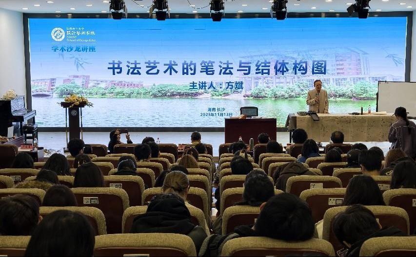 在受聘仪式后方斌先生做了《书法艺术的笔法与结体构图》的学术交流,他结合自身经历,阐述了书法艺术与工科教育的融合路径。他认为:“书法不仅是技艺,更是思维训练。工科生通过书法学习,可以培养空间感知力与创新思维,这对工程设计大有裨益。”