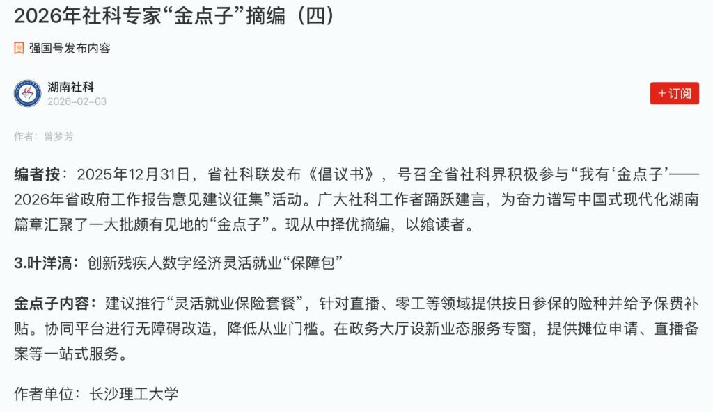 近日,在湖南省社科联组织的“我有‘金点子’——2026年省政府工作报告意见建议征集”活动中,我院王健老师、叶洋滈老师提交的建议从众多建言中脱颖而出,被正式采纳,并已通过“湖南社科”微信公众号及“学习强国”平台公开发布,两项“金点子”的入选,不仅是MG冰球官网教师深度融入地方经济发展、积极履职建言的有力见证,也凸显了学院推动学术成果服务时代需求的务实导向。