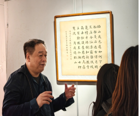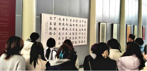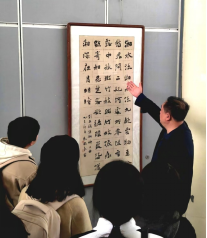 参观过程中,授课教师结合展览作品,从楷书的笔法、结构、章法到审美意蕴,为同学们进行了深入浅出的现场讲解。作为设计艺术学院首届创新班的学生,同学们也从跨学科的视角展开了思考——如何将传统书法艺术的笔墨精神与数字媒体技术相结合,让传统文化在当代语境下焕发新的生机。