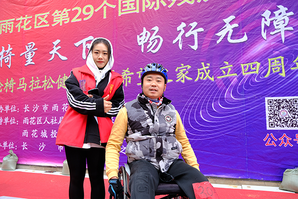 12月3日,“轮椅量天下,畅行无阻碍”轮椅马拉松健身赛于长沙市雨花区蓝天建材城顺利举办。此次活动由实践部组织开展,工美1901班黄靖怡、唐玲俐等17位志愿者参与此次活动。