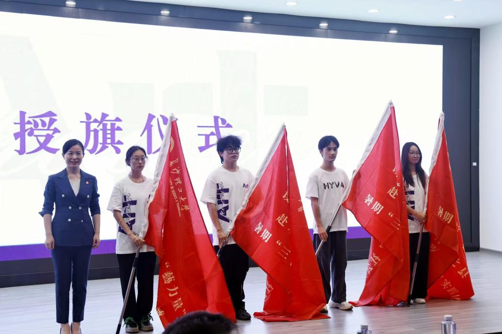 会上,各实践团队成员代表进行出征宣誓。郭剑为“三下乡”社会实践团队授旗。