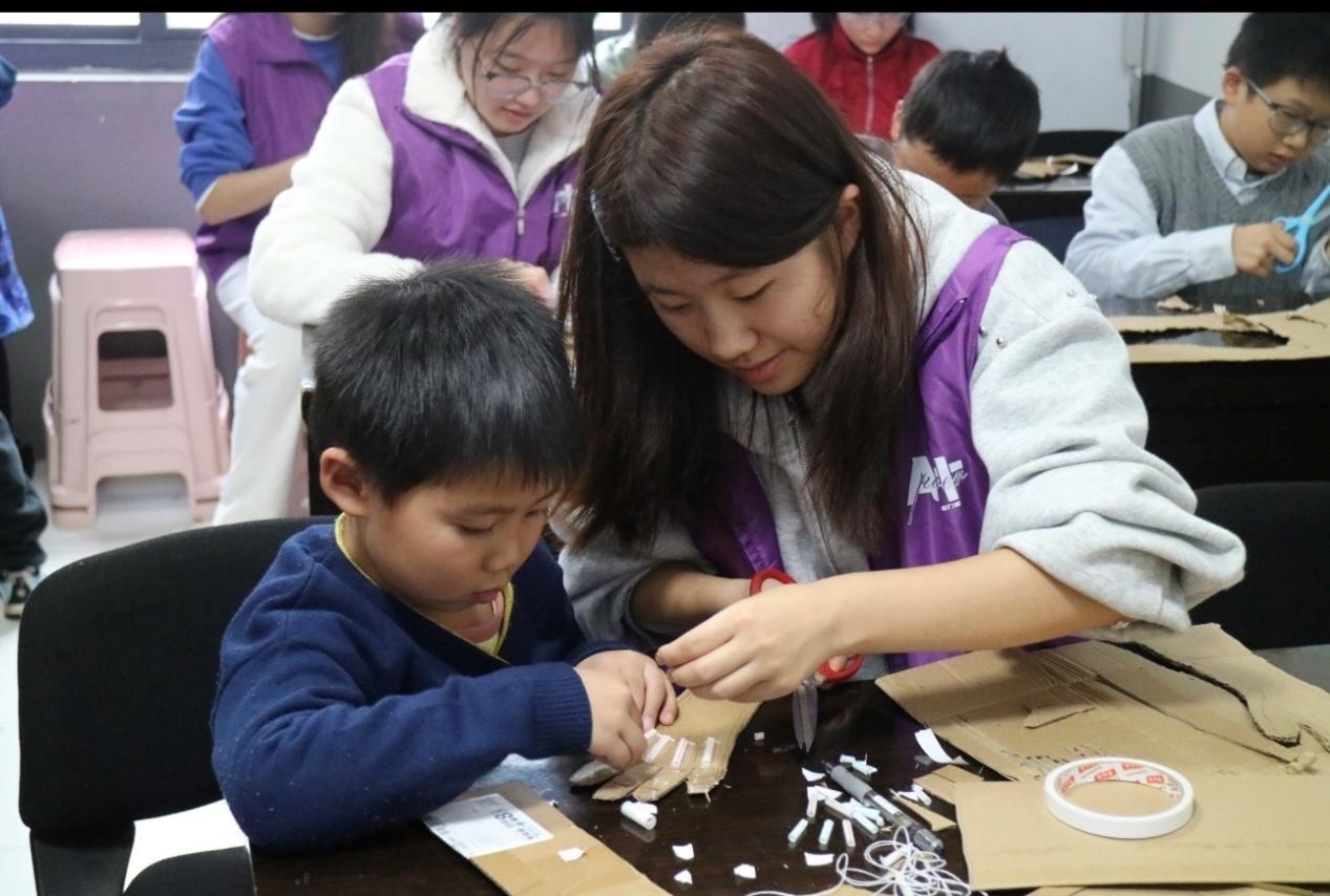 志愿者通过趣味PPT讲解与实操示范,拆解机械手臂的结构逻辑;动手环节中,孩子们分组协作,在志愿者的引导下打造出可操作的纸壳机械手臂,并踊跃分享创作细节。“玩中学、学中思”的氛围让孩子们充分感受手工与科学的融合乐趣。