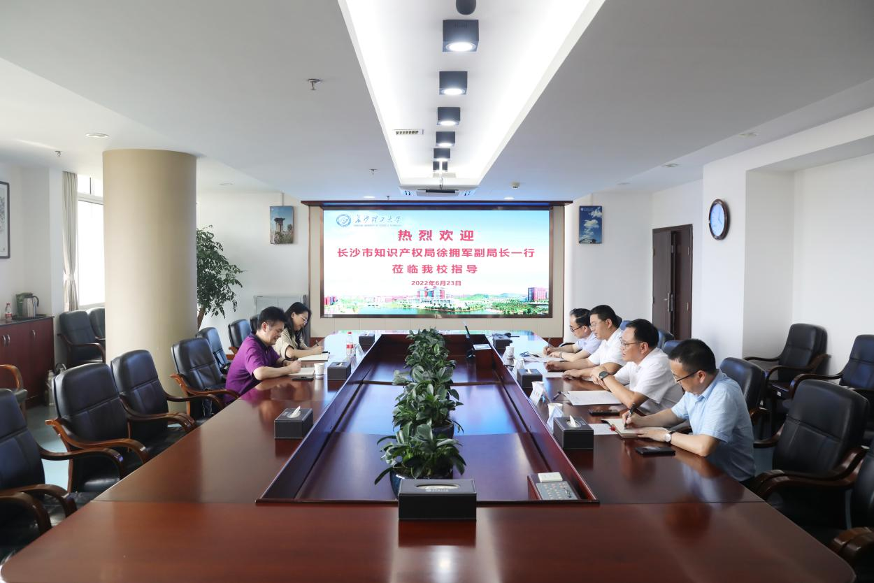 6月23日下午,长沙市知识产权局党组成员、副局长徐拥军等一行来MG冰球官网调研指导知识产权工作。校长曹一家,副校长刘朝晖,党政办公室、成果转化中心等负责人出席会议。会议由刘朝晖主持。
