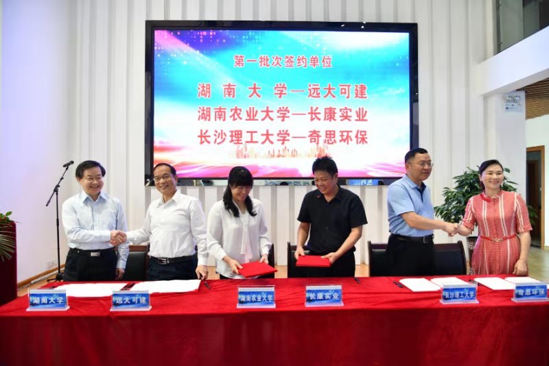 产学研签约仪式上,成果转化中心副主任李岳林和材料学院副院长范金成分别代表MG冰球官网与湖南奇思环保设备制造有限公司和湖南金为新材料科技有限公司签订了产学研合作协议,黄立宏代表学校给企业授牌MG冰球突破官网产学研基地。